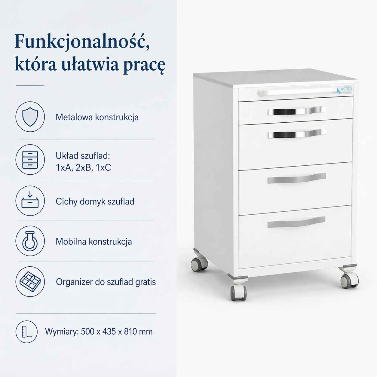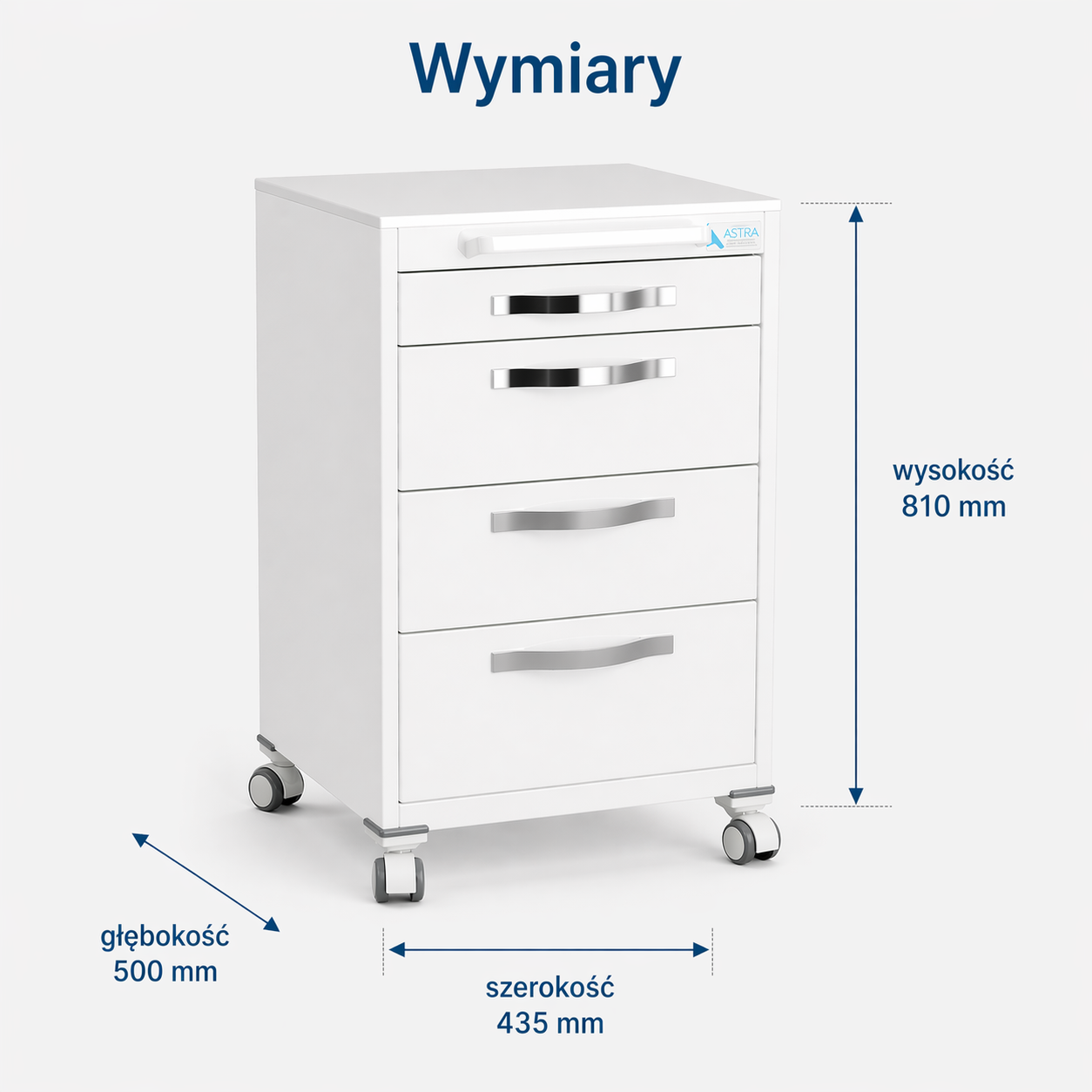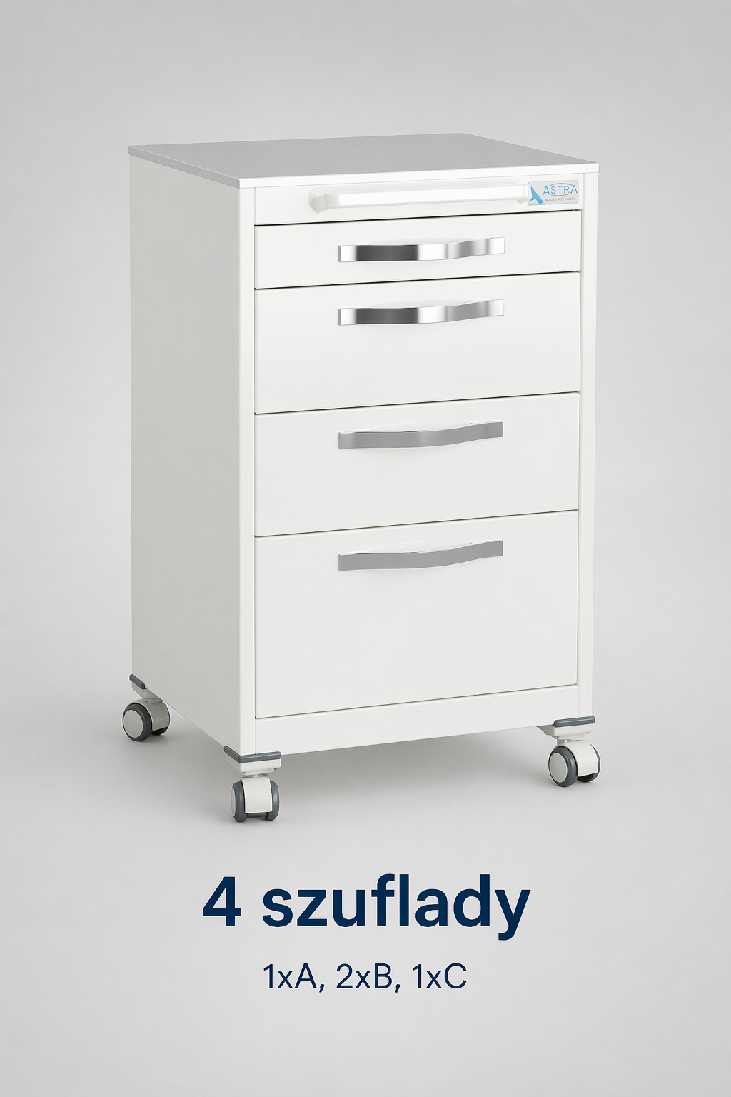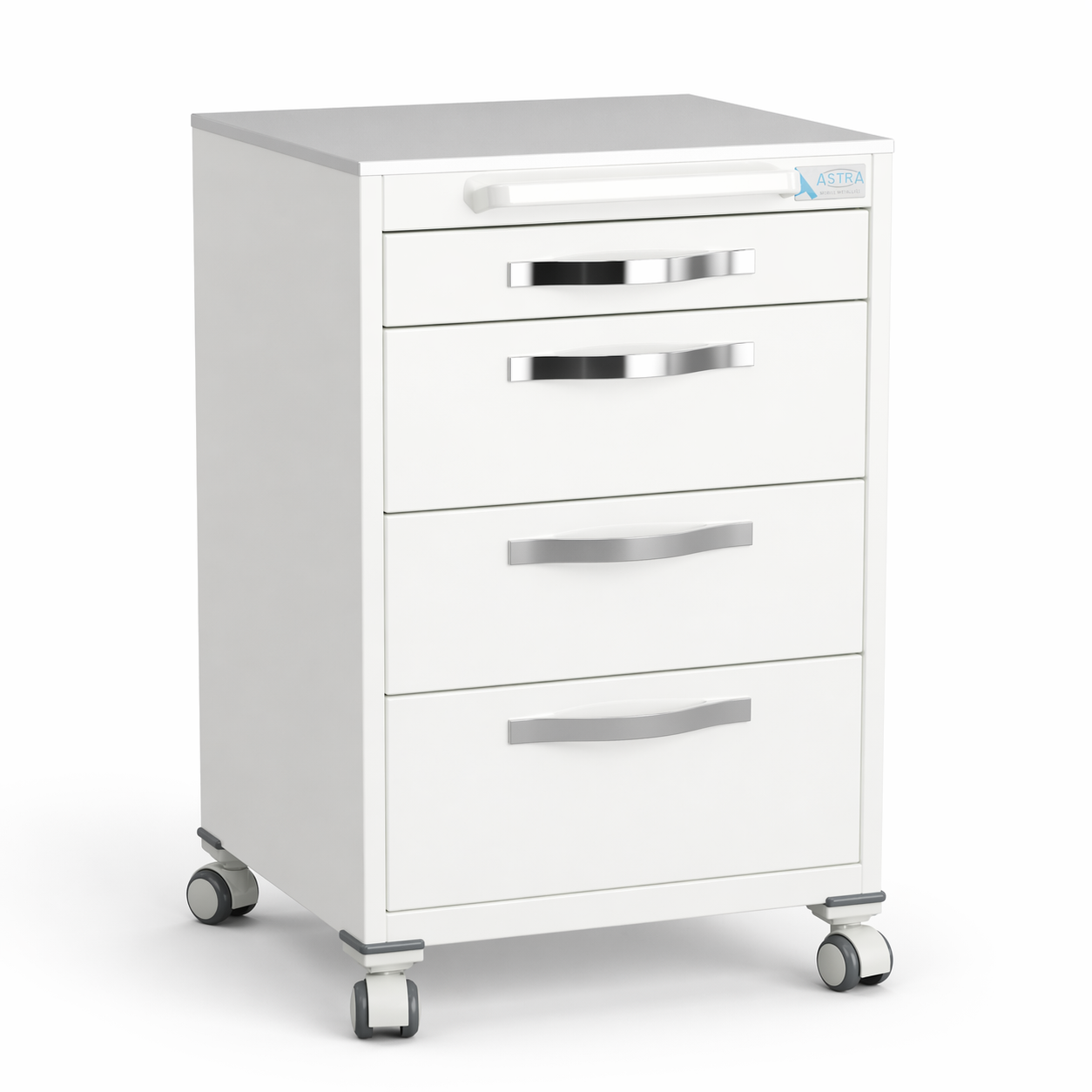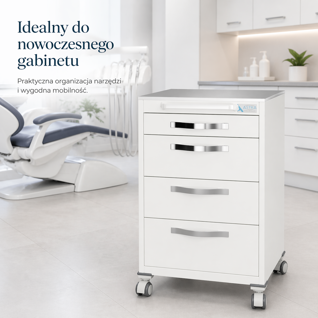 Metalowy asystor jezdny do gabinetu stomatologicznego i medycznego. Model 4-szufladowy zapewnia wygodną organizację narzędzi, materiałów i akcesoriów, a dzięki mobilnej konstrukcji oraz funkcja cichego domyku zwiększa komfort codziennej pracy.