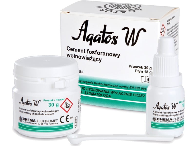 AGATOS W przeznaczony jest przede wszystkim do cementowania koron, mostów i wkładów koronowo-korzeniowych, a także jako materiał do czasowego wypełniania ubytków w zębach mlecznych. Bezpośrednie dodanie do proszku opiłków srebra zwiększa trwałość i twardość wypełnienia. W przypadku próchnicy głębokiej zaleca się umieszczenie podkładu między cementem a zębiną (preparat na bazie wodorotlenku wapnia). Można go również stosować do wypełniania kanałów korzeniowych, szczególnie w przypadku przygotowania zęba do resekcji wierzchołka korzenia. Cement powoduje szczelne zamknięcie otworu wierzchołkowego korzenia zęba. AGATOS W bardzo dobrze się zarabia, po związaniu wykazuje dużą wytrzymałość na ściskanie i odporność na działanie erodujące wody, śliny i związków znajdujących się w pokarmach. Charakteryzuje się krótkim czasem wiązania i małą kurczliwością, a także dobrą przylepnością i względną nieszkodliwością dla tkanek otaczających
