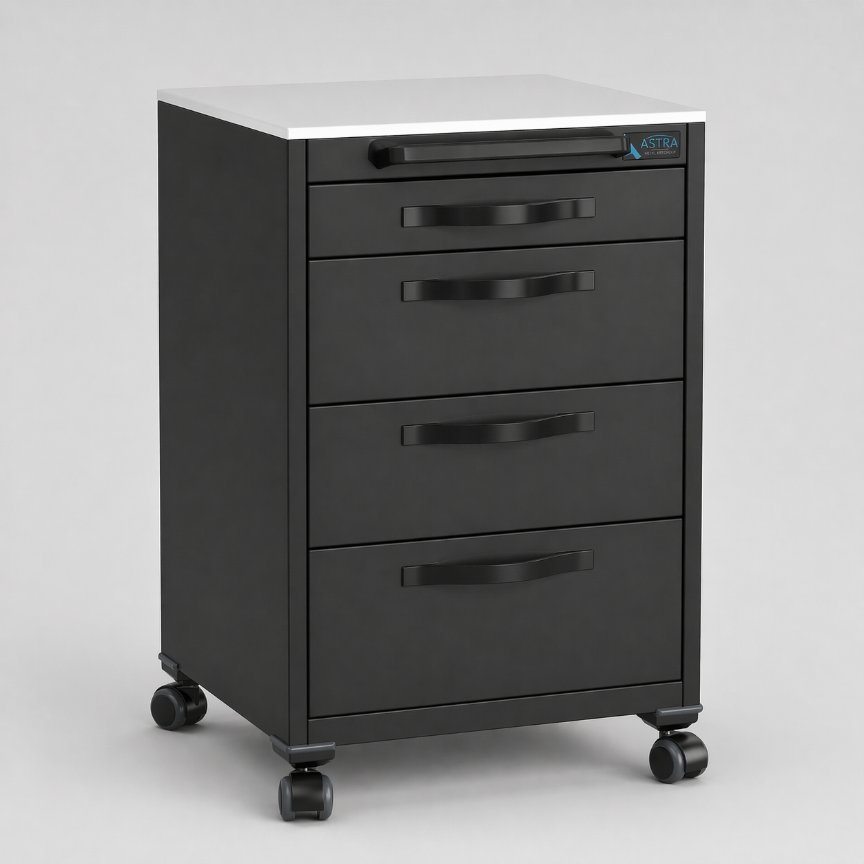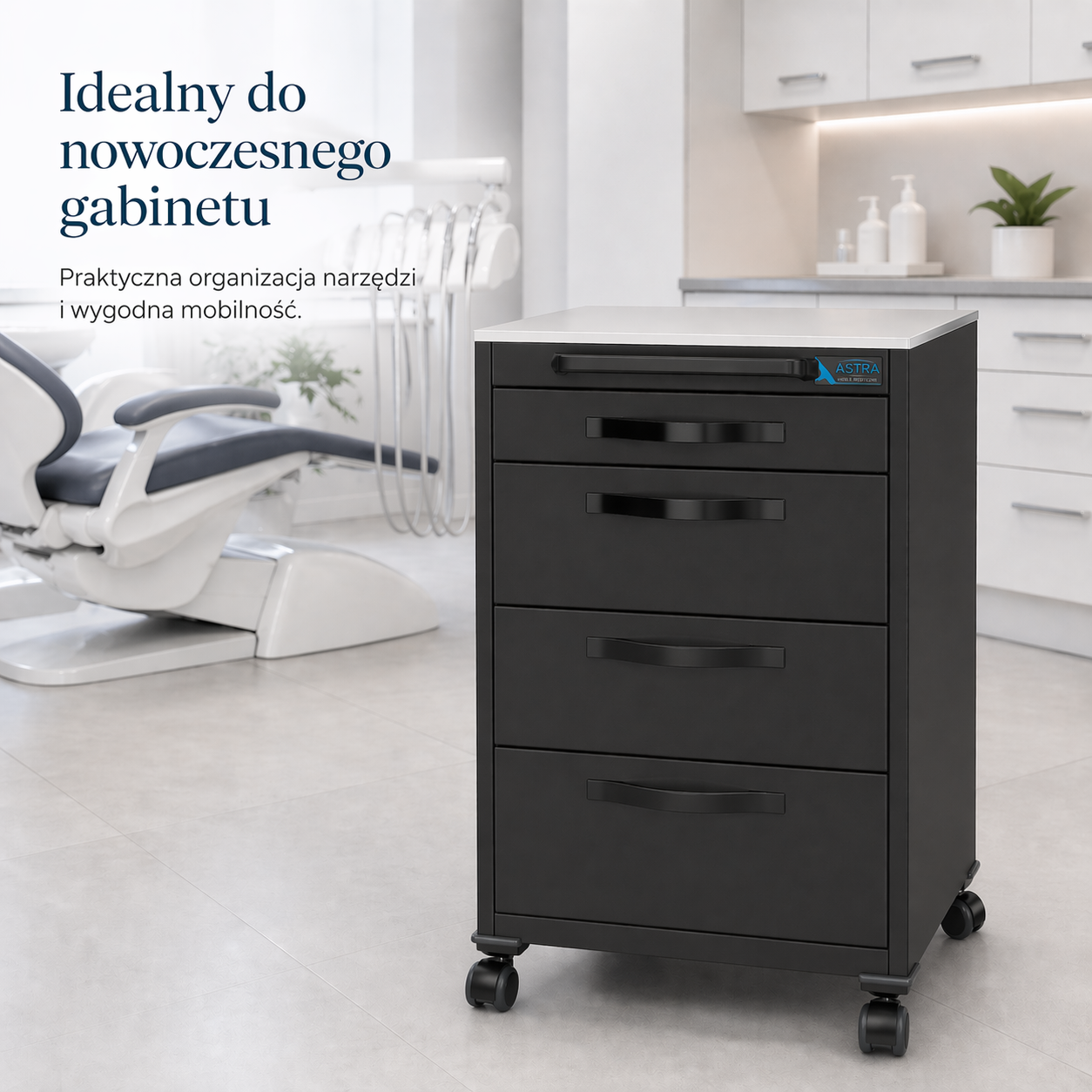 Metalowy asystor jezdny do gabinetu stomatologicznego i medycznego. Model 4-szufladowy zapewnia wygodną organizację narzędzi, materiałów i akcesoriów, a dzięki mobilnej konstrukcji oraz funkcja cichego domyku zwiększa komfort codziennej pracy.