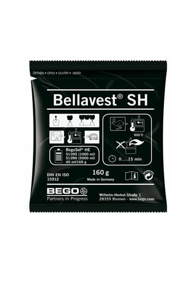 Szybko lub tradycyjnie wygrzewana masa osłaniająca do precyzyjnego odlewania koron i mostów. Również do ceramiki prasowanej, metali szlachetnych i nieszlachetnych. Bellavest SH może być stosowany do wielu stopów dentystycznych poza tytanem. Wspaniałe efekty odlewania uzyskuje się ze stopami nieszlachetnymi np. Wirobond C, a również ze stopami szlachetnymi i ceramiką prasowaną. Daje się łatwo rozrabiać przy zastosowaniu płynu Begosol HE. Nie zawiera grafitu, jest związana fosforanami. Czas rozrabiania 5 minut. Daje bardzo gładkie powierzchnie odlewnicze. Utwardza się przy znacznej wytrzymałości krawędzi, daje się łatwo uwalniać.