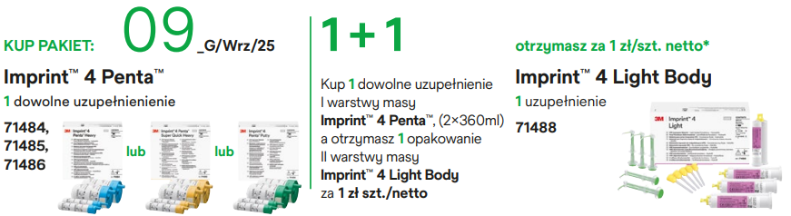 Kup 1 dowolne uzupełnienie I warstwy masy Imprint™ 4 Penta™, (2x360ml) a otrzymasz 1 opakowanie II warstwy masy Imprint™ 4 Light Body za 1 zł szt./netto