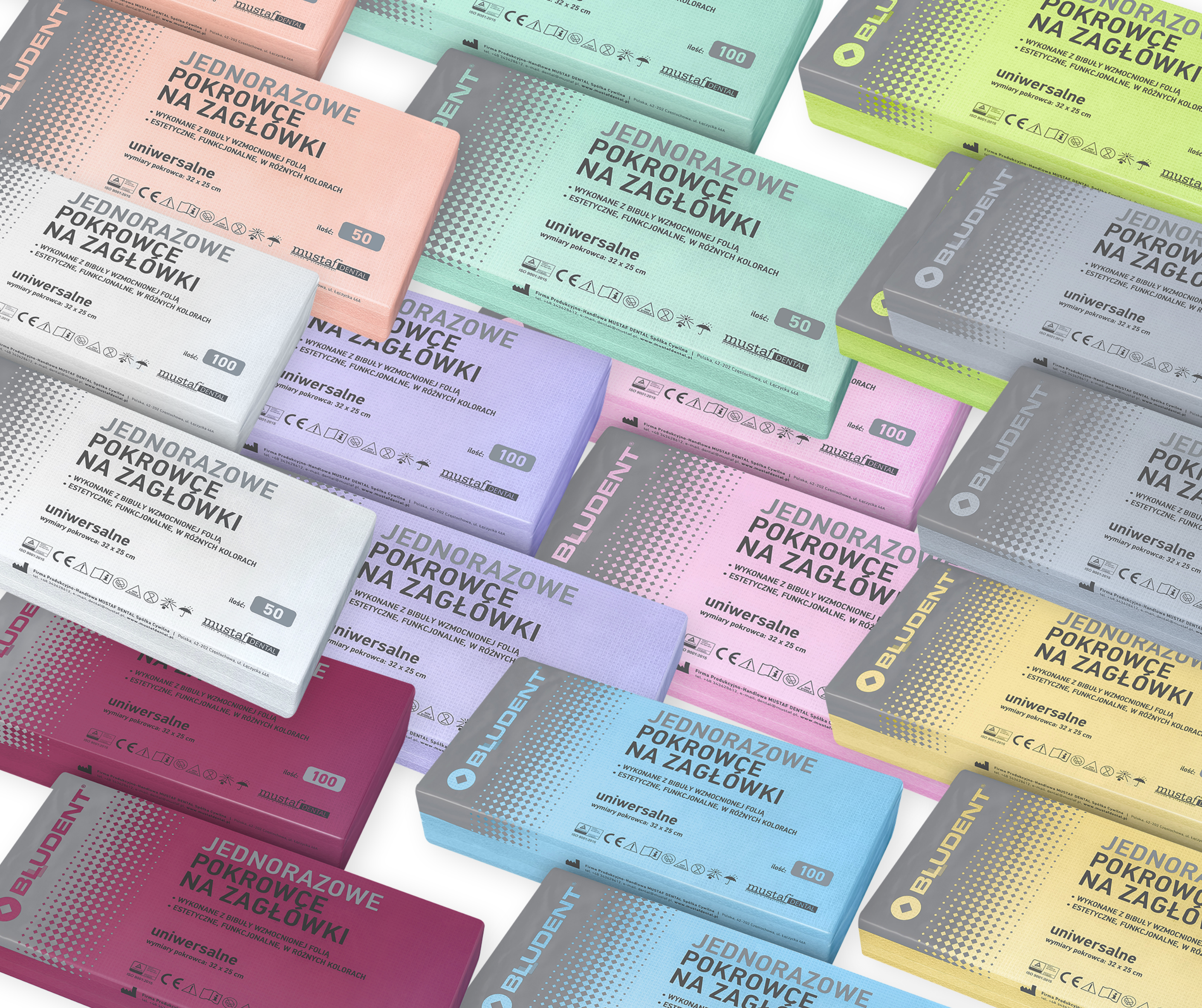 Produkowane kolory w opakowaniach 100 sztuk: biały, fioletowy, limonkowy, niebieski, pomarańczowy, różowy, szary, zielony, żółty.